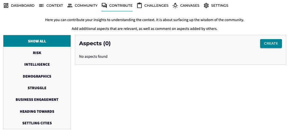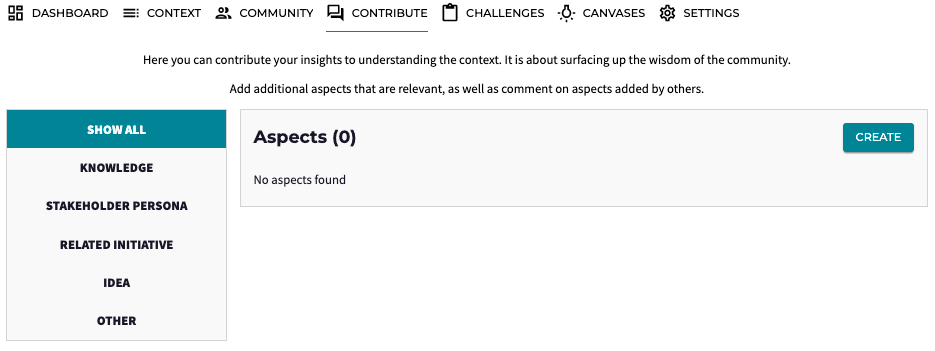 Sharing your insights is easy! As a Member of a Community you can contribute to topics you care about. These insights are called Aspects on Alkemio. Within each Hub, Challenge, or Opportunity, you can find Aspects under the Contribute Tab.