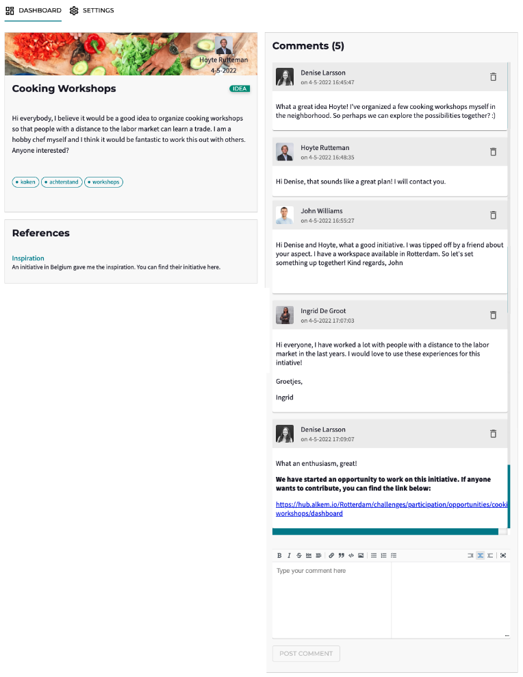 After raising an Aspect, the Community can see who created it, respond to it and in that way start a discussion around it. For example, you can find others with knowledge and resources related to your idea and start an Opportunity: