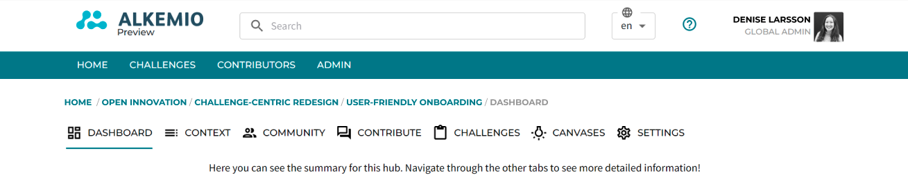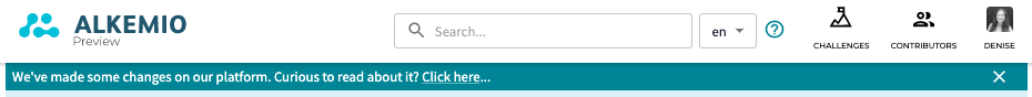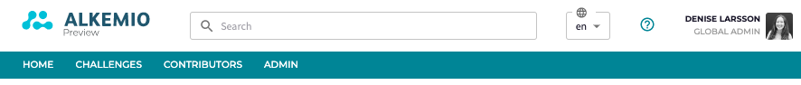 The key elements of our platform menu can now be found as icons on the top right: Challenges, Contributors, your Profile and - if applicable - your Admin settings. This is where you can explore all the Challenges on the platform as well as the individuals and organizations contributing to those Challenges.