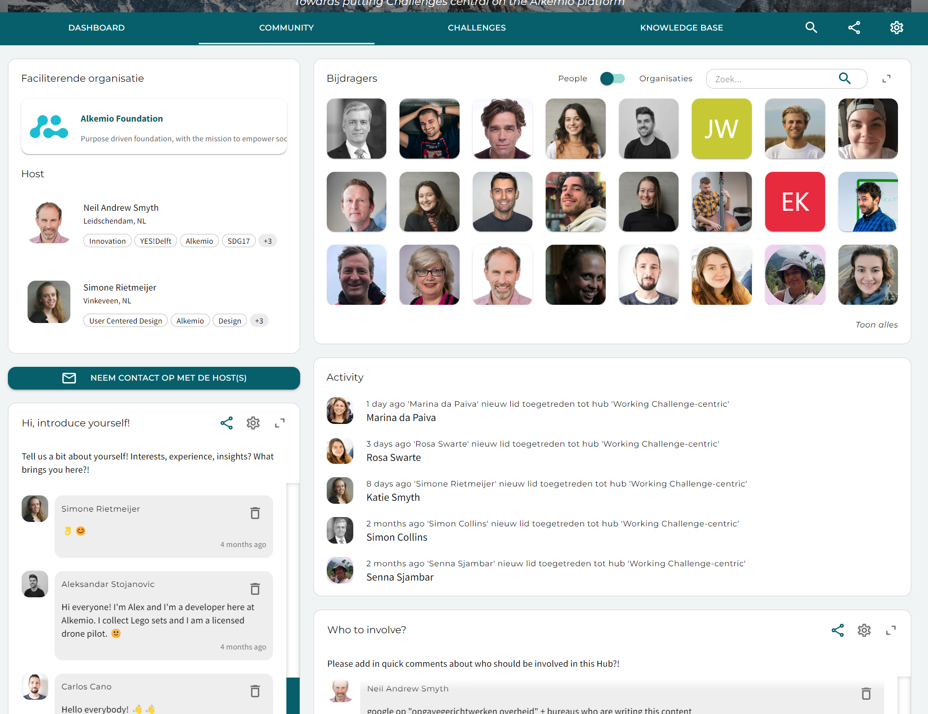 All these questions will be answered in the Community tab. You will find the people and organizations already part of this Space, recent new members, and the Facilitating organization and Host. Also, members will find discussions, whiteboards, and posts created by the hosts that are related to (building) the community. For example, a question for members to introduce themselves, the ability to contribute to a stakeholder map visualized on a whiteboard, or to provide ideas for other stakeholders to invite in this Space.